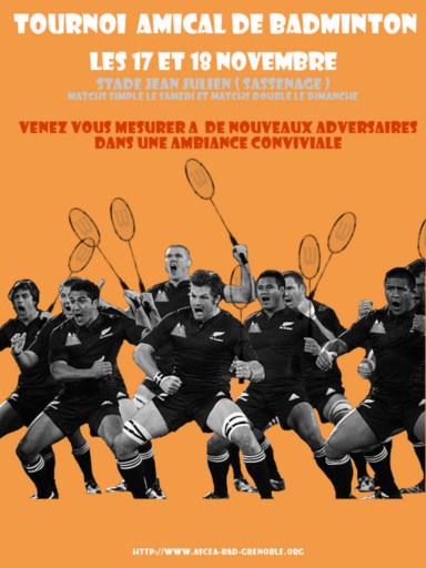 un tournoi amical le week-end du 17/18 novembre dans la grande halle du stade Jean Julien. Il s'agira de matches courts (1 set de 21 pts), afin que chacun rencontre tous les adversaires, avec les objectifs essentiels suivants : jouer au bad et s'amuser, bien sûr, mais aussi rencontrer des partenaires de jeu avec qui venir jouer par la suite.